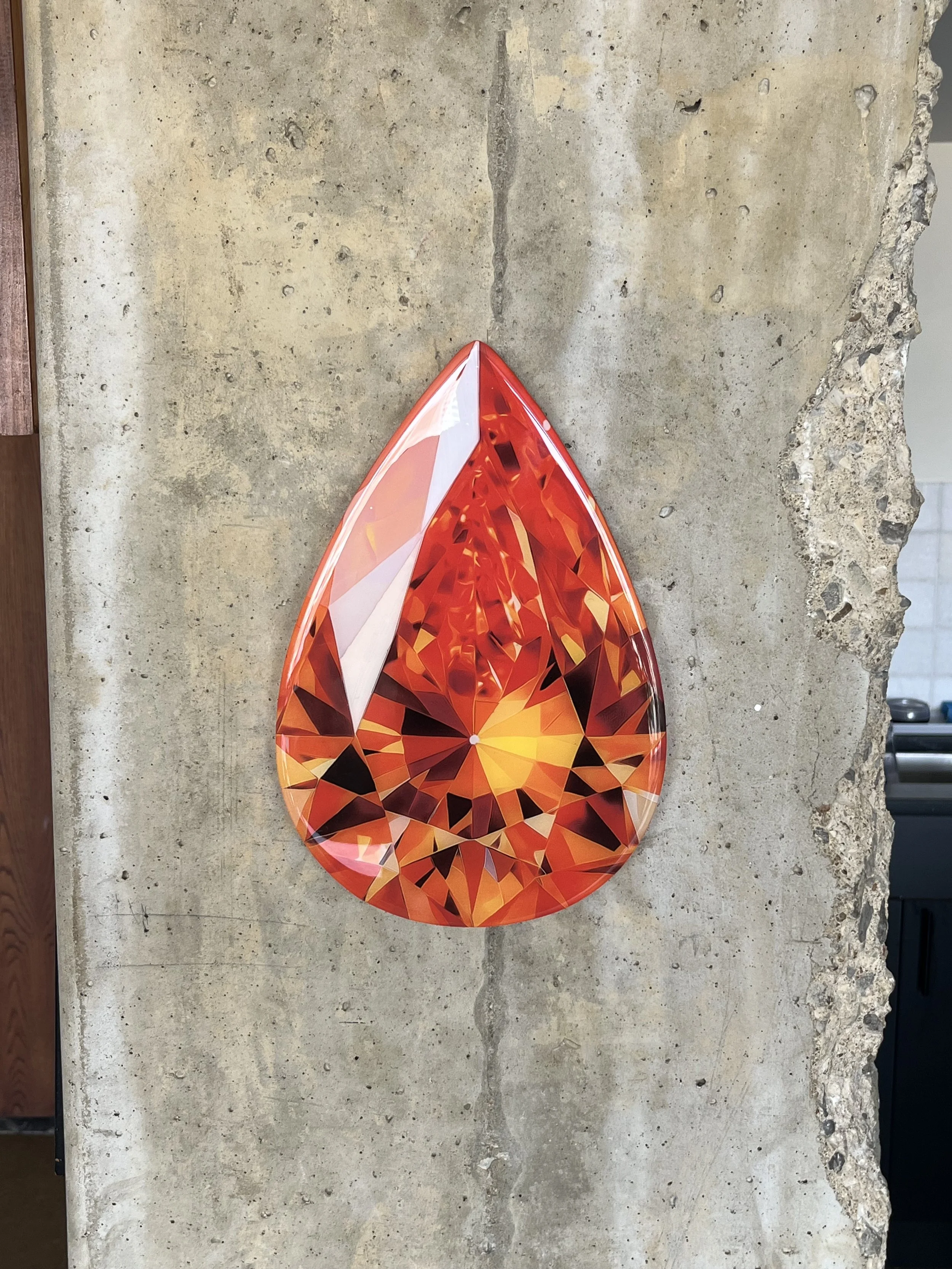 All Gems from the BEJEWELED Capsule Collection are one of a kind mixed media collectible art objects. Each gem is meticulously hand cut from wood. Hand painted acrylic embellishments are applied on top of digitally illustrated prints then finished with hand painted colored pop side details. Each gem is painstakingly finished in multiple layers of hand poured crystal epoxy resin to offer a high gloss gemstone finish.